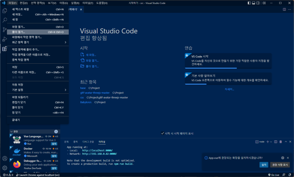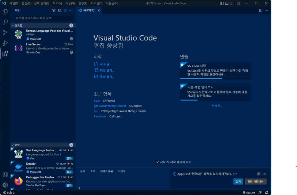 기본적인 VSCode의 초기화면인데 Korean Language Pack 과 Live Server를 설치했다. 설치는 화면 제일 좌측에 조각난 네 개의 사각형을 누르면 다른 컴포넌트를 조회할 수 있고 클릭 몇 번으로 간단히 설치할 수 있다. Live Server는 굳이 필요없지만 VSCode에서 디버그를 컨트롤 해 준다고 해서 깔아보았다. 실제로는 Chrome에서 직접 해도 되지만 통합하여 디버그 하는 것이 더 편리할 수 있을거라는 생각에 한번 해 보기로 했다.