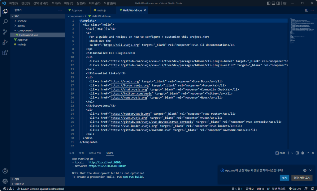 아하. 이렇게 디렉토리 구조를 만들어주는 구나 하고 일단 넘어가기로 한다. components 밑에 있는 HelloWorld.vue 파일에 실제 화면에 띄워주는 내용이 들어가 있고, App.vue는 이 내용을 초기화하여 화면에 붙여 주는 부분, main.js는 index.html이 해야 하는 vue 프레임웍을 읽어오는 부분과 이를 화면 <div> element에 mount 해주는 (붙여주는) 역할을 한다는 것을 알 수 있다.