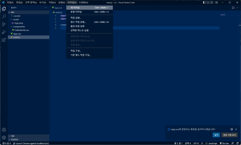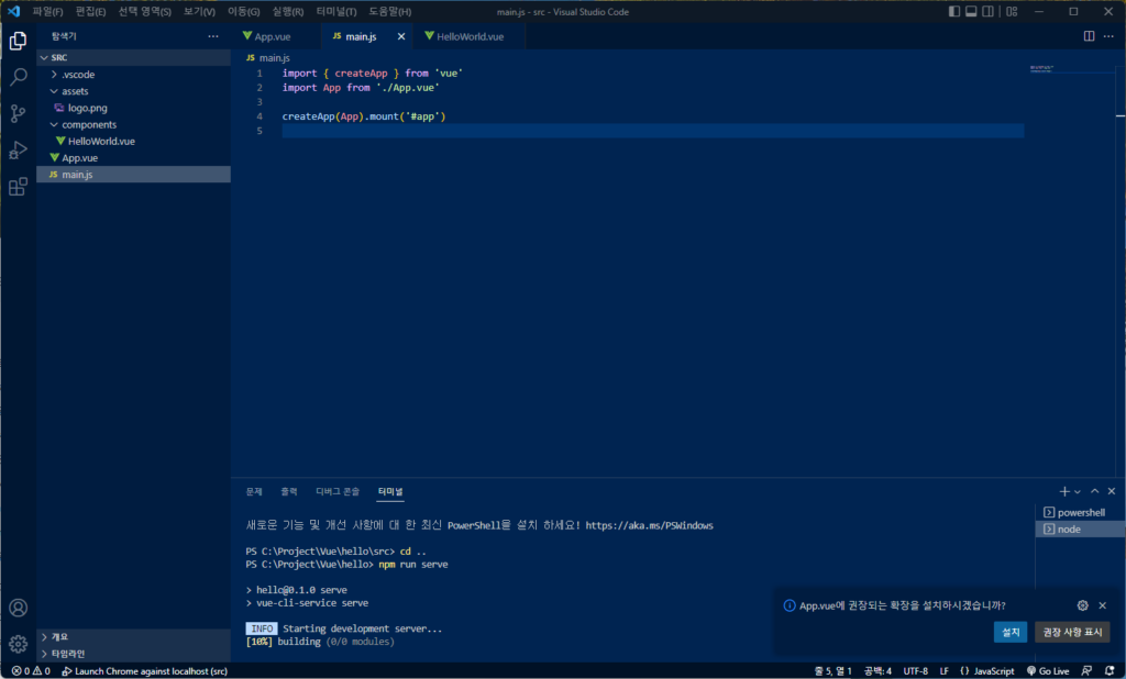 터미널을 실행하고 개발용 웹서버를 PC 상에서 실행한다. 지난 시간에 해 보았던 npm run serve 명령이다.