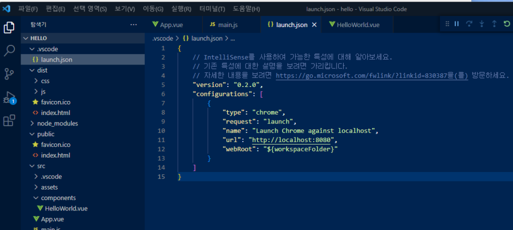 우선 vue.js를 설치하고 생성한 첫번째 프로젝트인 HelloWorld 프로젝트를 VSCode에 불러서 어떻게 디버그 하는지 확인을 하고, Vue에서 만들어 주는 프로젝트는 도대체 어떻게 구성되어 있는지 보도록 하자.