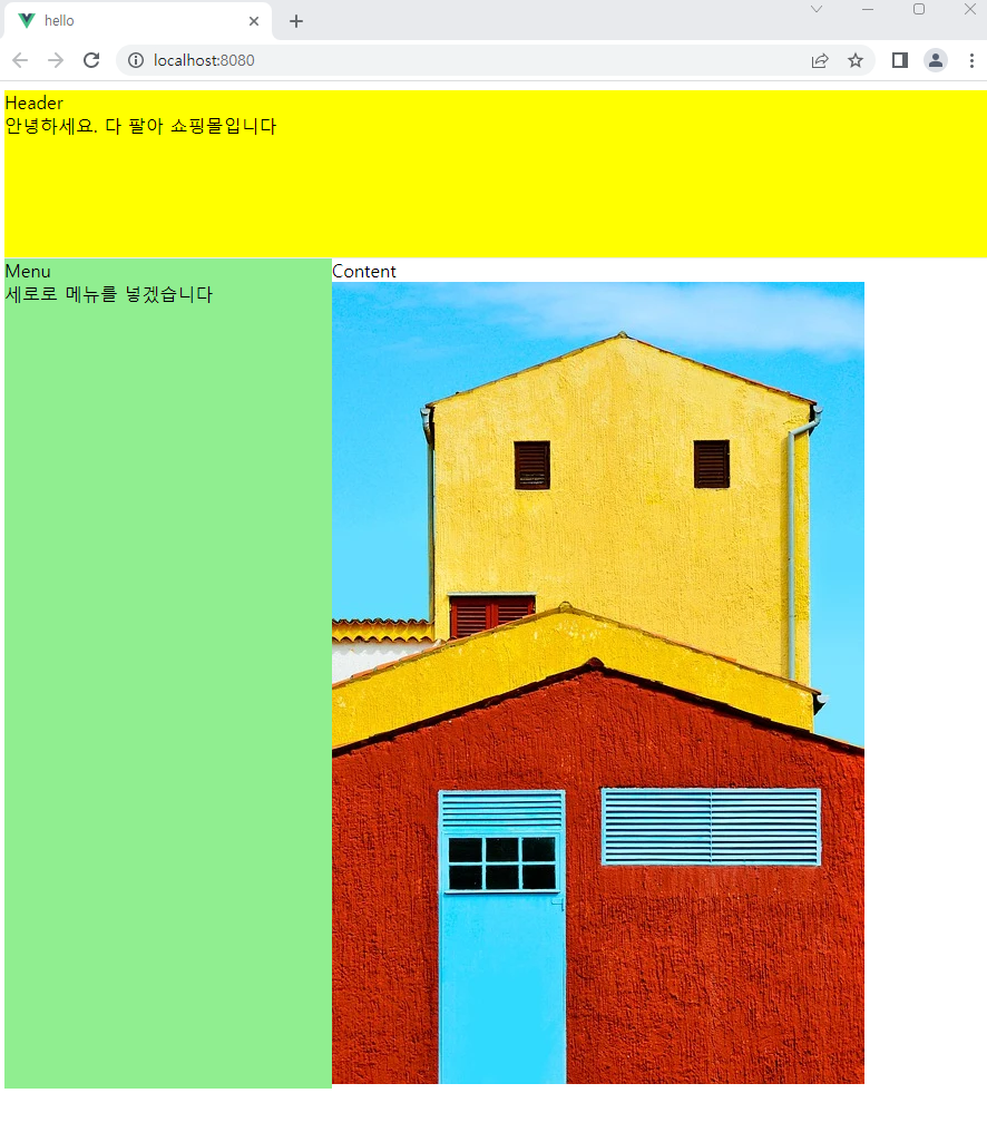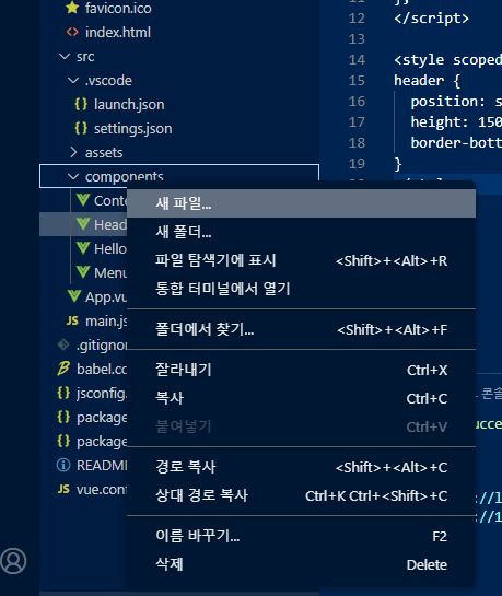 각각 Header.vue, Menu.vue, Content.vue로 각각 만들어준다.