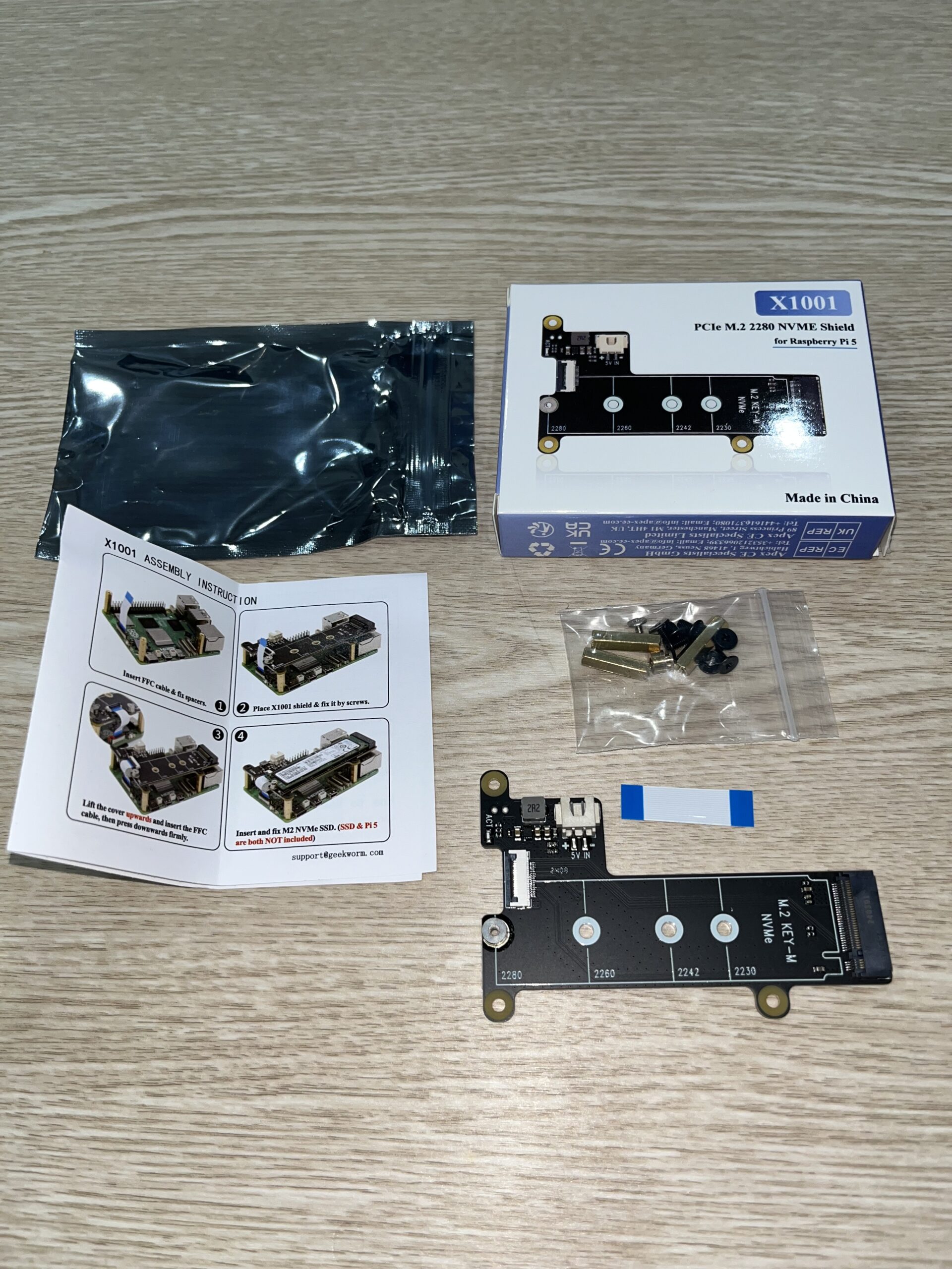 라즈베리파이 5의 PCIe to NVMe M.2 SSD HAT과 케이스를 구매 결정하고 1주에서 2주 정도 걸려 모든 제품이 도착했다. Geekbord X1001 모델을 알리에서 구매하고 케이스와 정품 액티브 쿨러는 엘레파츠에서 구매하였다.